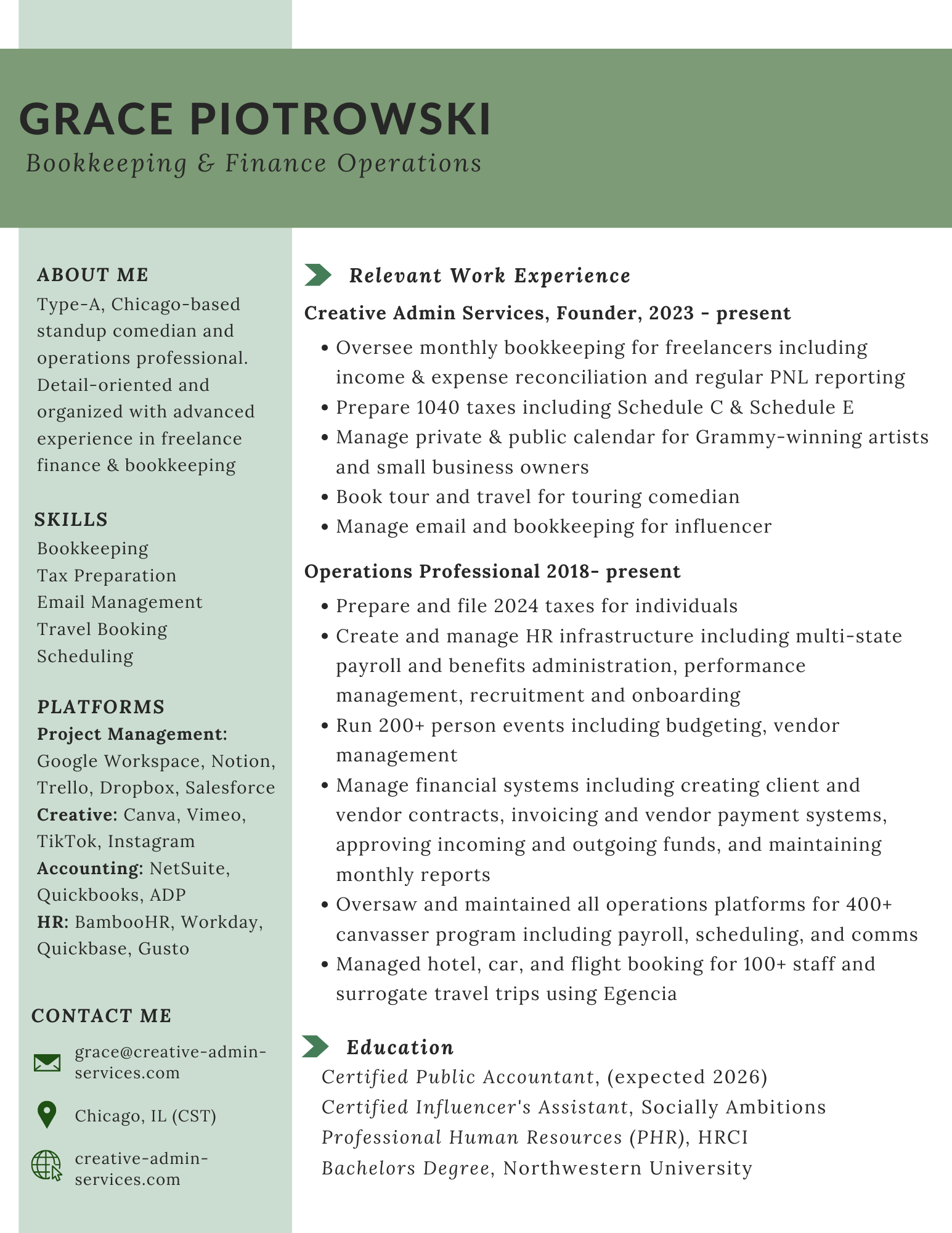 Creative Admin Services is where Grace Piotrowski, a type-A standup comedian, merges her background in the arts with her professional expertise in finance and business operations to support other creatives including comedians, musicians, content creators, and more.